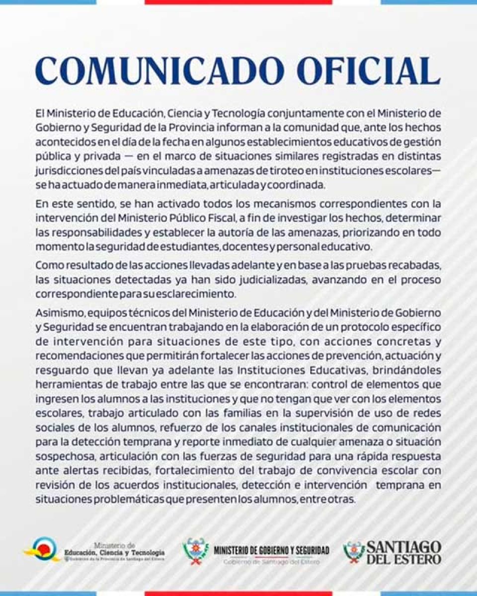 Según el comunicado oficial, se activaron todos los mecanismos correspondientes con intervención del Ministerio Público Fiscal, con el objetivo de investigar los hechos, determinar responsabilidades y establecer la autoría de las amenazas. Desde el Gobierno remarcaron que en todo momento se priorizó la seguridad de estudiantes, docentes y personal educativo.