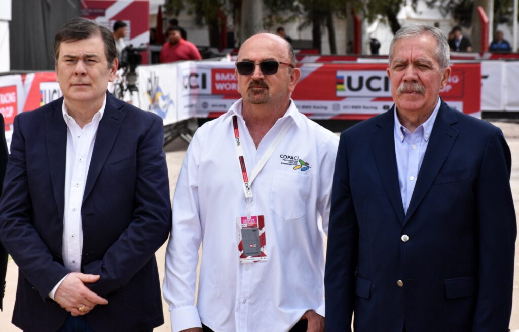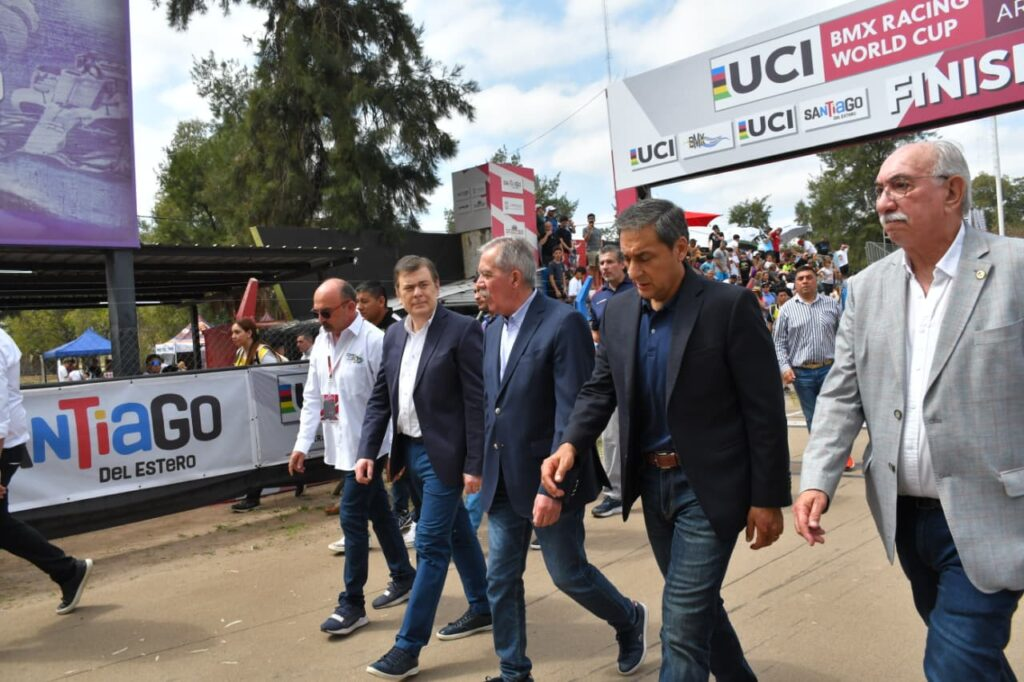 El gobernador Gerardo Zamora junto al jefe de gabinete de ministros, Elías Suarez, participó de la primera jornada de la Copa del Mundo UCI BMX Racing 2025, que se desarrolla del 20 al 21 de septiembre en la pista la Catedral del BMX del Polideportivo provincial, convocando a 300 pilotos de 26 países.
