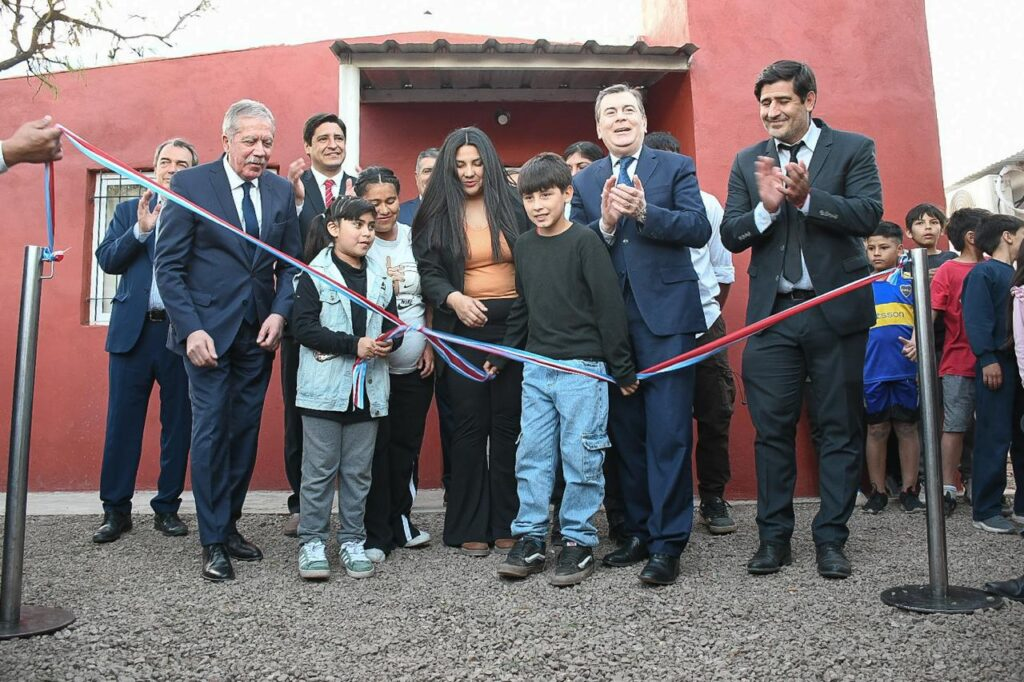 En primera instancia la comitiva entregó las llaves de las unidades habitacionales construidas por la municipalidad local con fondos de la provincia. El corte de cintas simbólico se hizo en el domicilio de Claudia Fabiana Acuña.