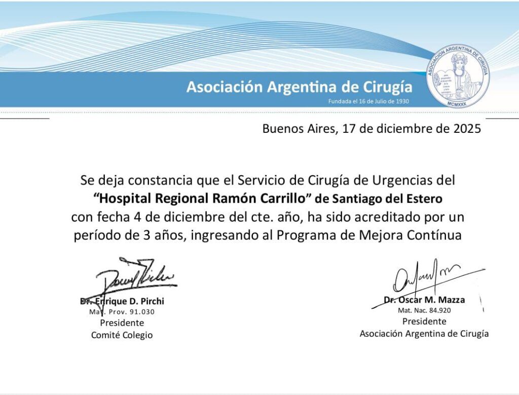 Los Servicios de Cirugía General y de Cirugía de Urgencia del Hospital Regional Dr. Ramón Carrillo fueron acreditados por la Asociación Argentina de Cirugía (AAC) por un período de tres años, e incorporados al Programa de Gestión de Mejora Continua, un reconocimiento de alcance nacional que avala la calidad asistencial, la seguridad de la atención y el nivel de complejidad del servicio.