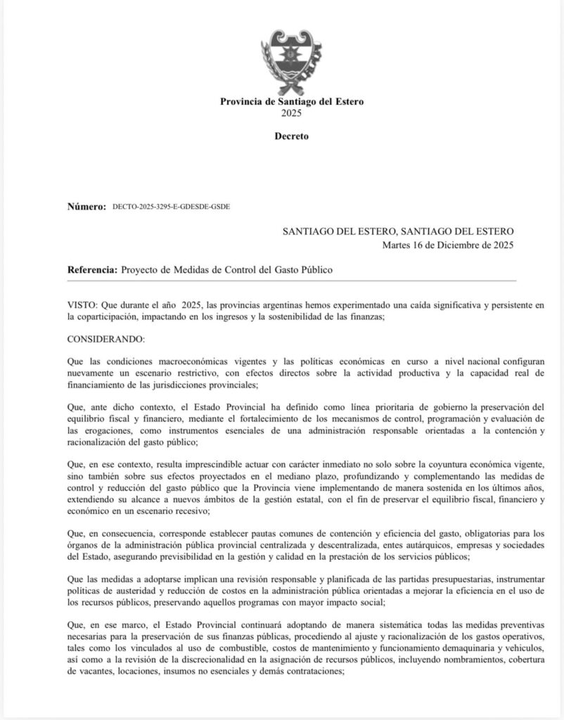 El decreto tendrá vigencia a partir del 10 de diciembre de 2025, por un plazo de 12 meses, con posibilidad de ser prorrogado por igual período o dejado sin efecto, total o parcialmente, si se superan las causas que motivaron su implementación. Desde el Gobierno provincial se destacó que estas medidas buscan asegurar una administración responsable de los recursos públicos, priorizando el impacto social y la continuidad de los servicios esenciales para todos los santiagueños.