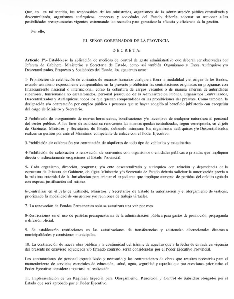 Entre las principales medidas, se establece la prohibición de nuevas contrataciones de recursos humanos, cualquiera sea su modalidad u origen de financiamiento, incluyendo programas con fondos nacionales o internacionales, así como la restricción en la cobertura de vacantes y designaciones, con excepción de cargos políticos específicos. Asimismo, se limita el otorgamiento de horas extras, bonificaciones e incentivos, cuya eventual autorización quedará sujeta a la evaluación de las máximas autoridades del Poder Ejecutivo.