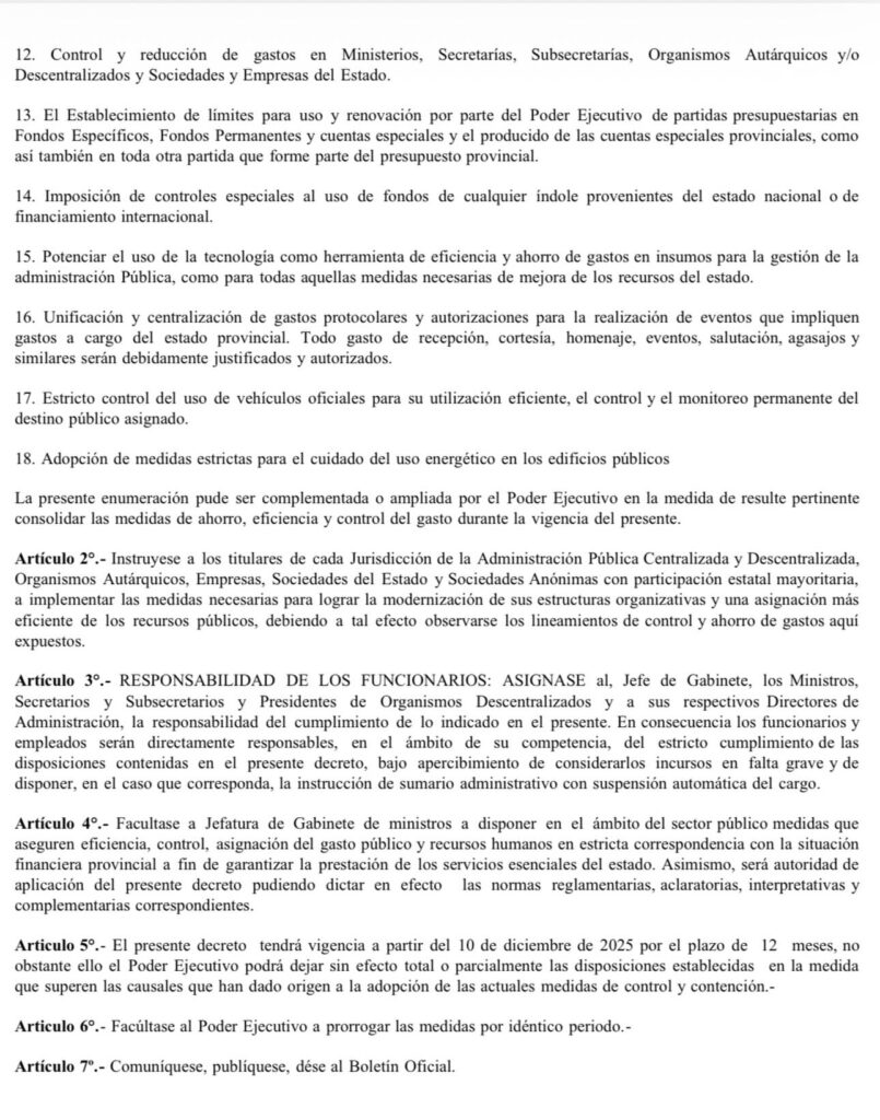 El decreto dispone el fortalecimiento de los mecanismos de programación, control y evaluación del gasto público, estableciendo pautas obligatorias de austeridad y eficiencia que alcanzan a la administración pública centralizada y descentralizada, organismos autárquicos, empresas y sociedades del Estado, con el fin de garantizar previsibilidad en la gestión y la continuidad de los servicios públicos.