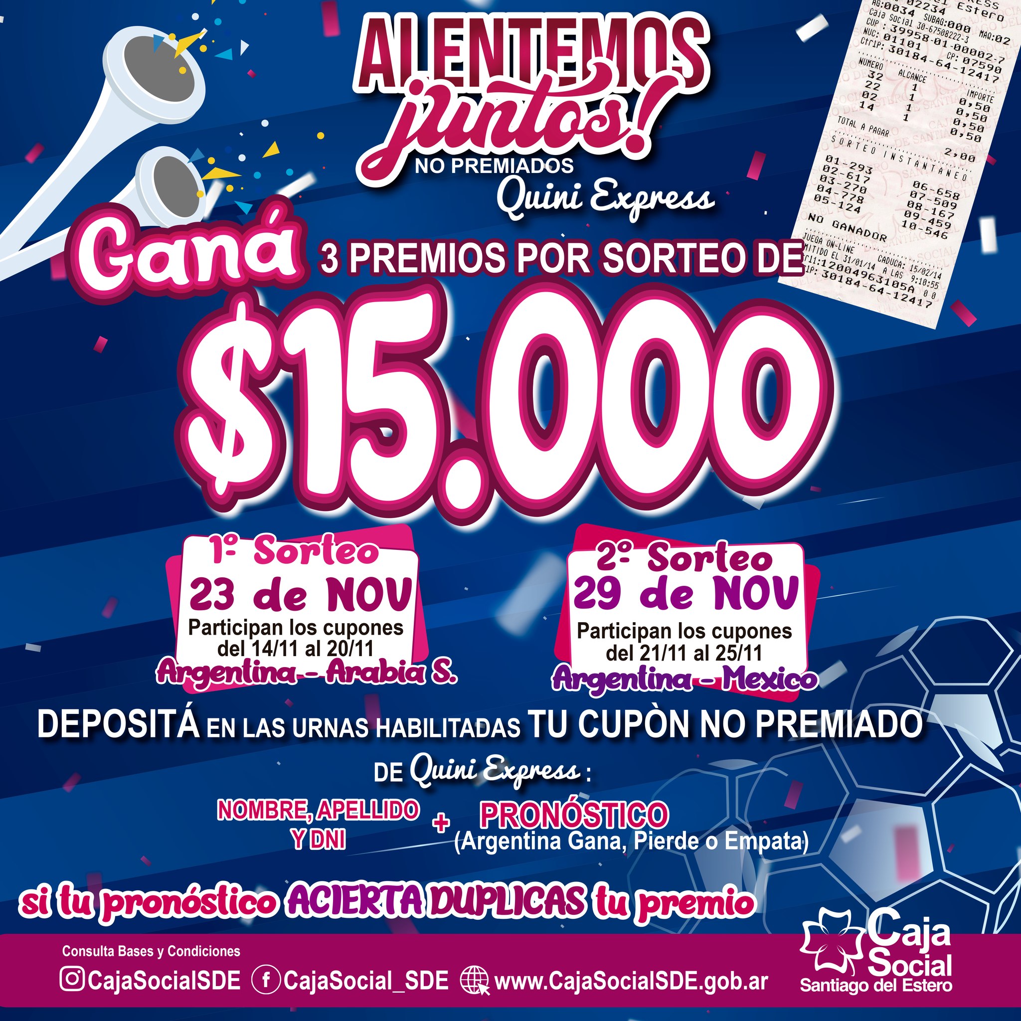 Para participar de esta promoción cada apostador deberá completar el dorso de su Cupón no Premiado de Quini Express con sus datos personales: Nombre y Apellido, Tipo y Número de DNI y realizar un pronóstico deportivo (gana, pierde o empata) sobre el resultado del Primer y Segundo Partido que dispute durante el Mundial de Fútbol 2.022 la Argentina: con Arabia Saudita el día Martes 22/11 (Primer Partido) y contra México el día Sábado 26/11 (Segundo Partido).