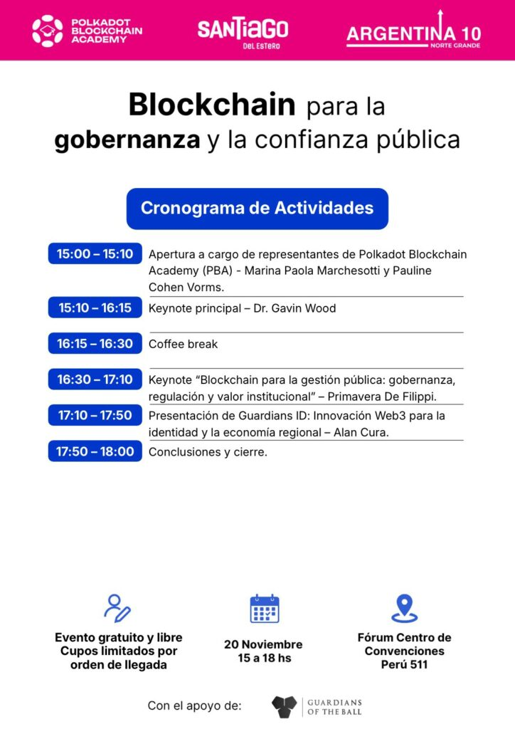 Según el cronograma, la apertura institucional a cargo del Gobierno de Santiago del Estero y de Polkadot Blockchain Academy (PBA) – Marina Paola Marchesotti y Pauline Cohen Vorms, será el miércoles 19, a las 14 horas.